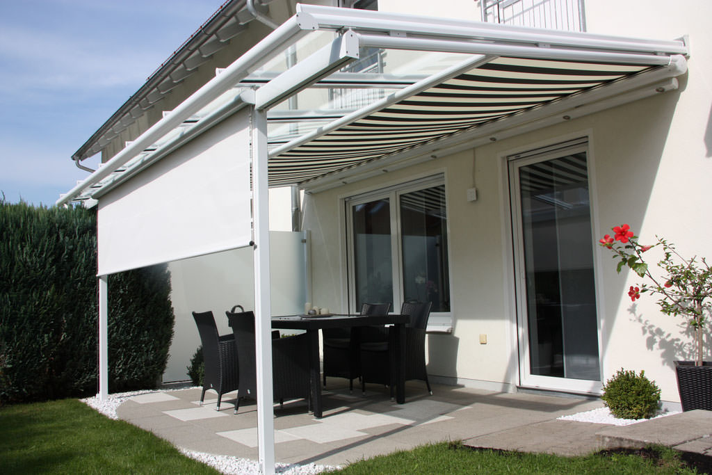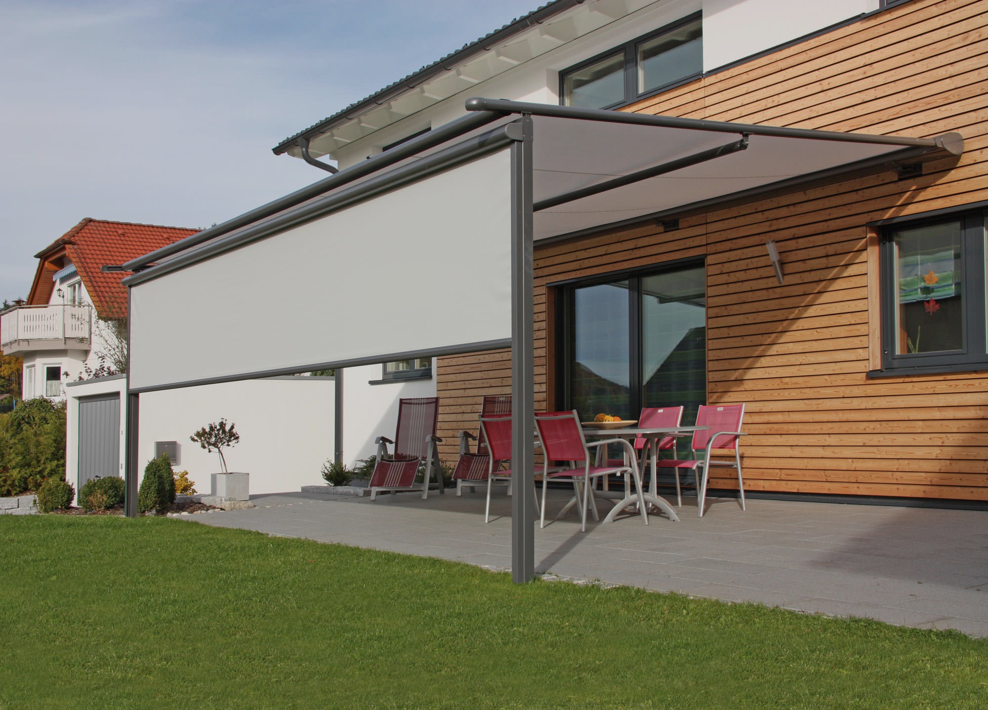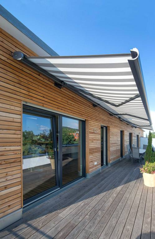 Unsere Lösung: Intelligente Sonnenschutzsysteme wie Markisen, Raffstores oder Screens halten Hitze draußen – und sehen auch noch gut aus.