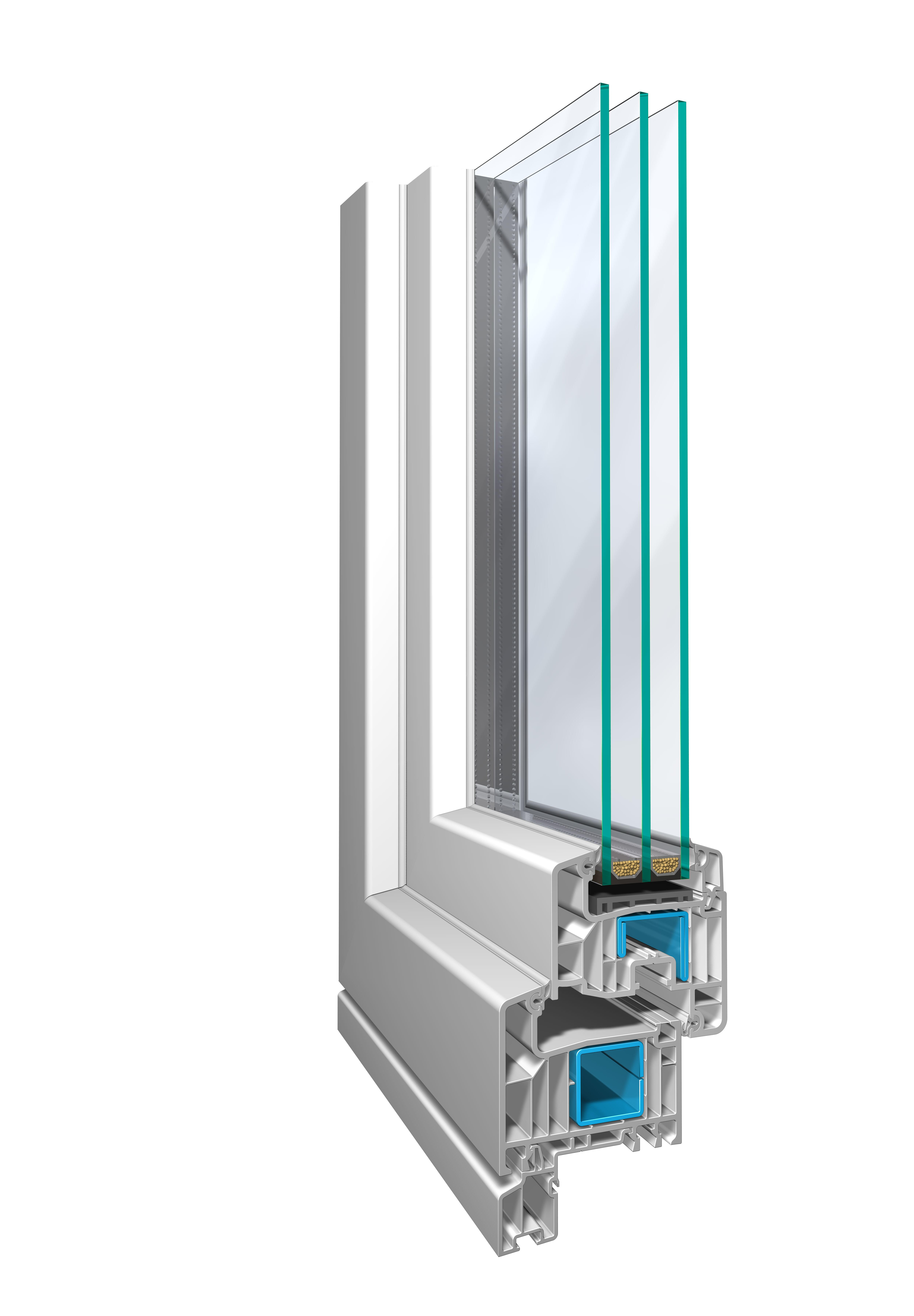 Das Kunststoffprofil zeigt im Querschnitt eine ausgeklügelte Mehrkammerstruktur mit Stahlverstärkung, die für Stabilität, Energieeffizienz und Langlebigkeit sorgt. Eine moderne Lösung für pflegeleichte Fenster mit hohem Wärmeschutz.