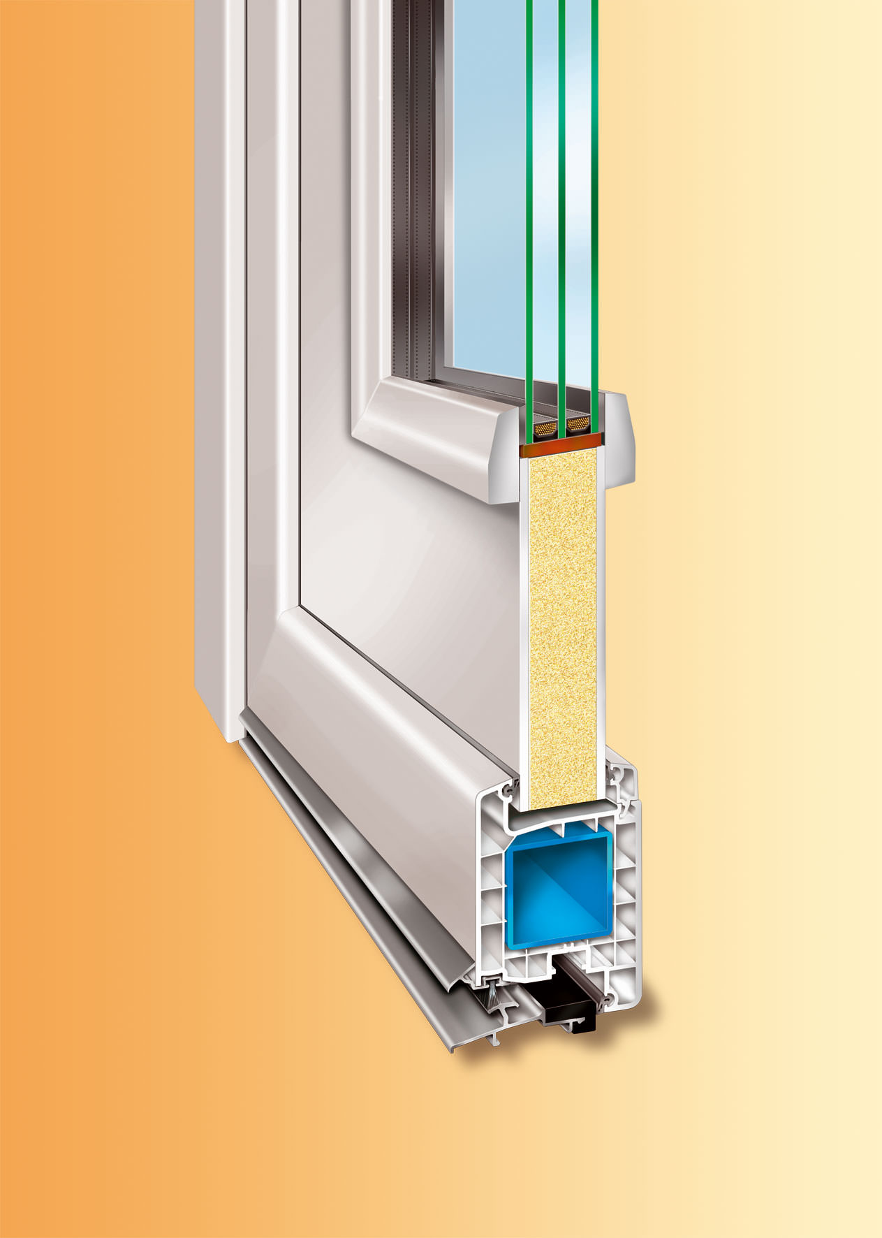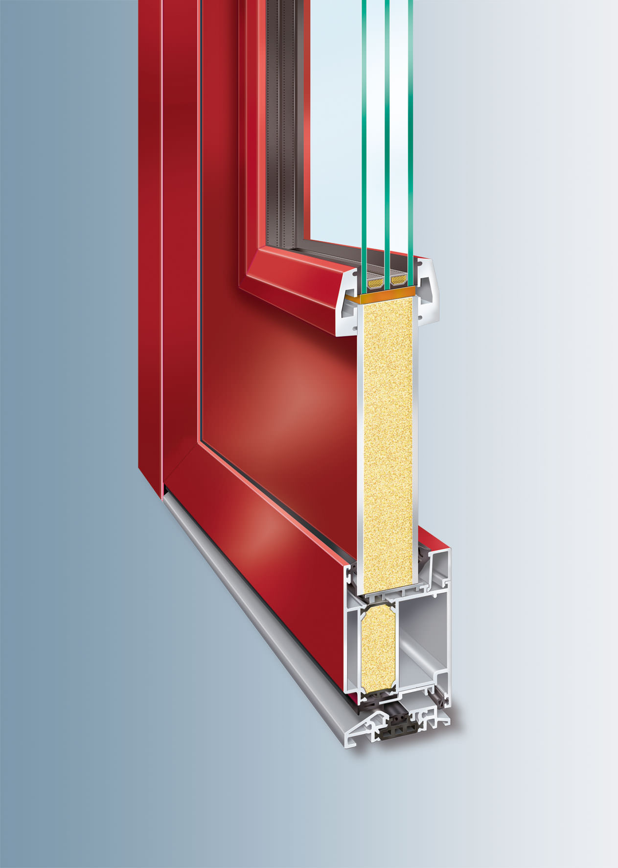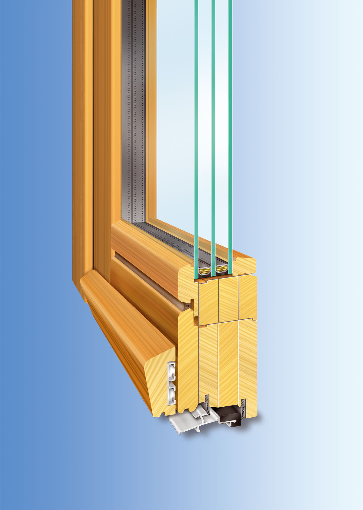 Die grafischen Querschnitte zeigen anschaulich die konstruktiven Unterschiede zwischen den Materialien Holz, Kunststoff und Aluminium – und damit auch die jeweiligen Vorteile.