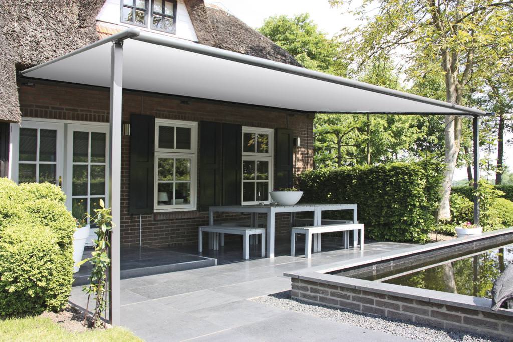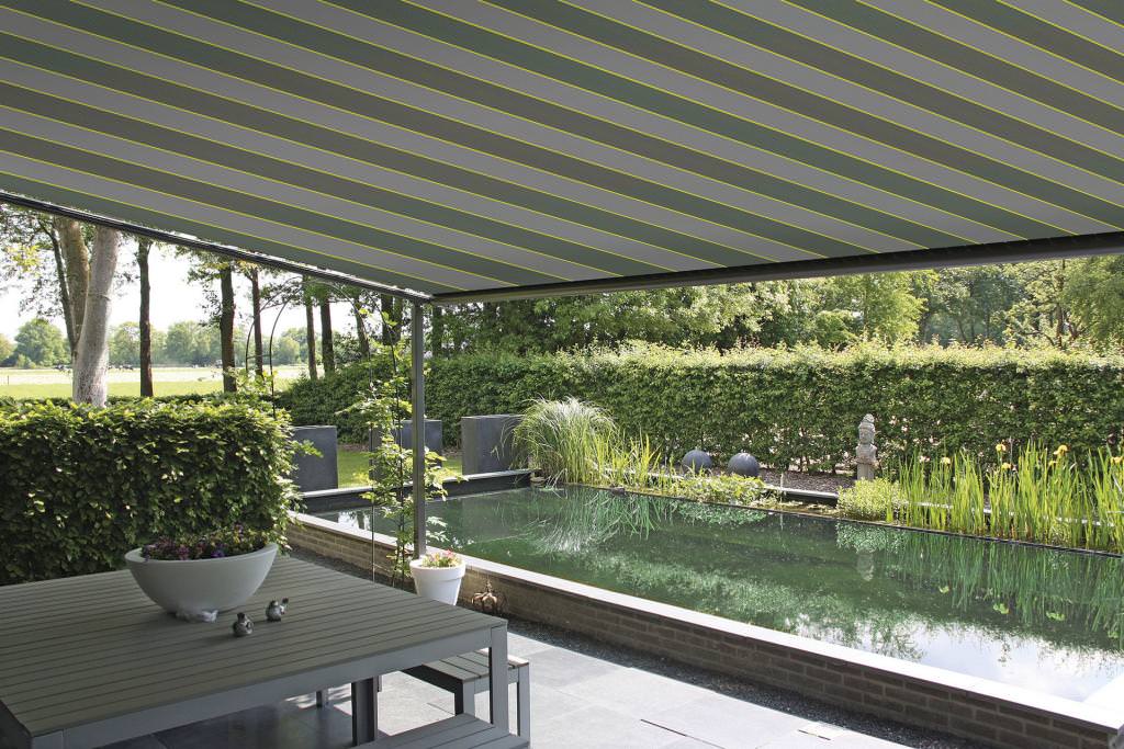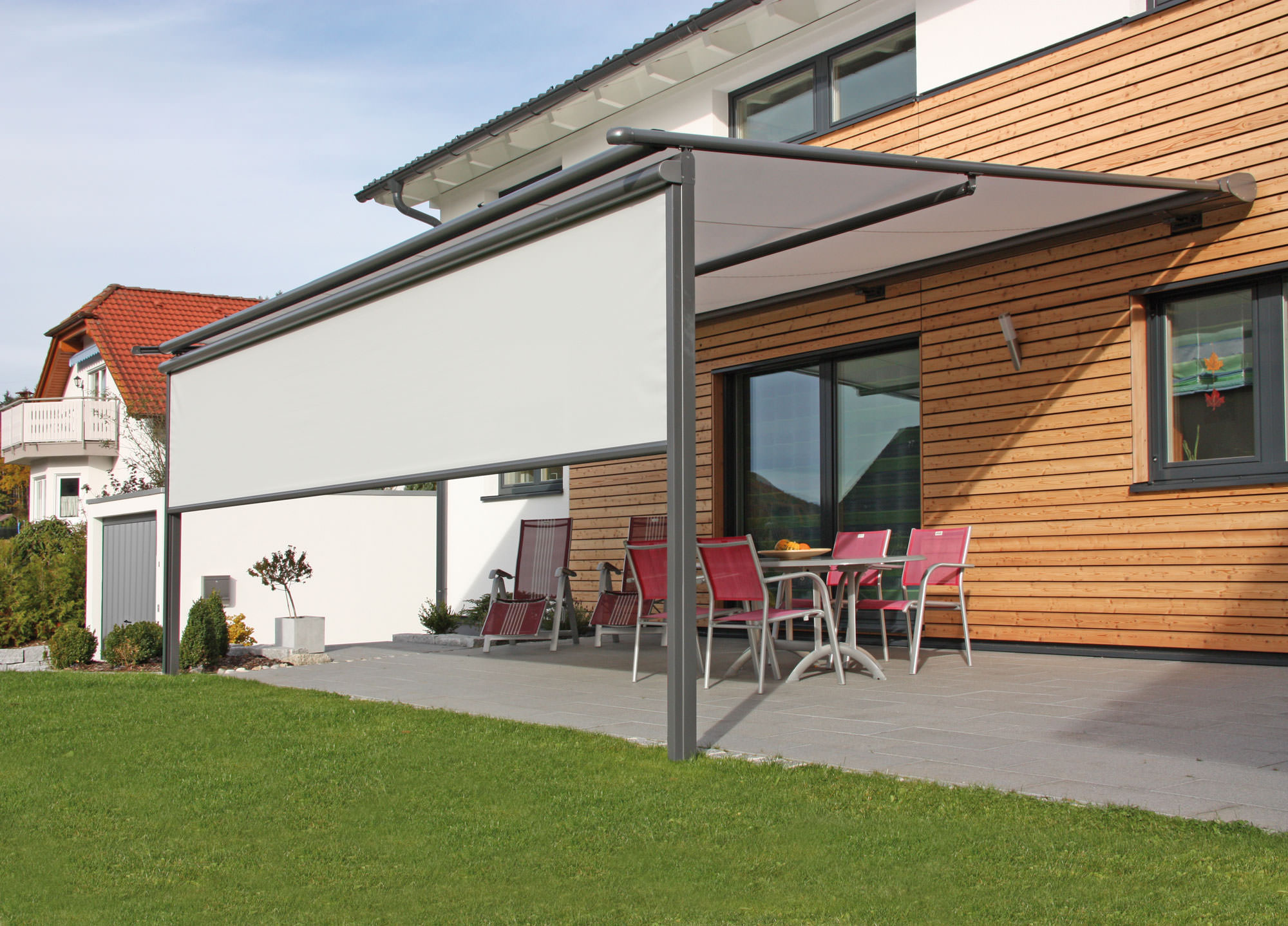 Pergolamarkisen sind eine raffinierte Mischung aus ausfahrbarem Sonnenschutz und feststehender Pergola. Filigrane Stützen tragen die Schienen für den Markisenstoff, während die Pergola fest im Boden verankert ist. Eine Pergolamarkise vereint damit Flexibilität und Stabilität.