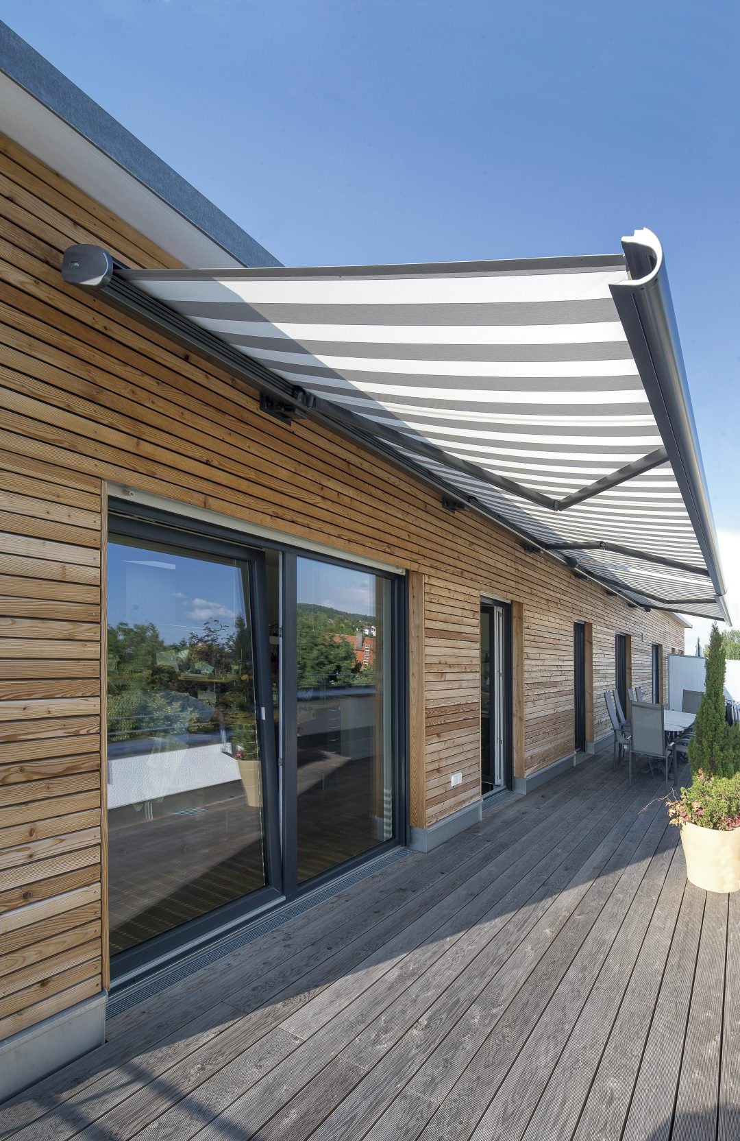 Kassettenmarkisen vereinen besten Schutz für Terrasse und Balkon mit modernster und eleganter Optik. In geschlossenem Zustand der Markise sind Tuchrolle, Gelenkarme und Technik in der Kassette geschützt. Weil sie keinen Umwelteinflüssen ausgesetzt werden, sind sie besonders witterungsbeständig.