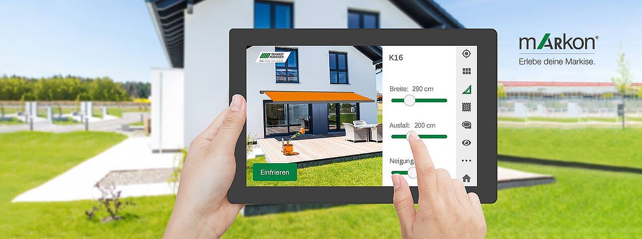 Und das Beste: Mit unserer Markisen-App sehen Sie live vor Ort, wie verschiedene Varianten an Ihrer Hauswand aussehen würden – direkt auf dem Tablet oder Smartphone.